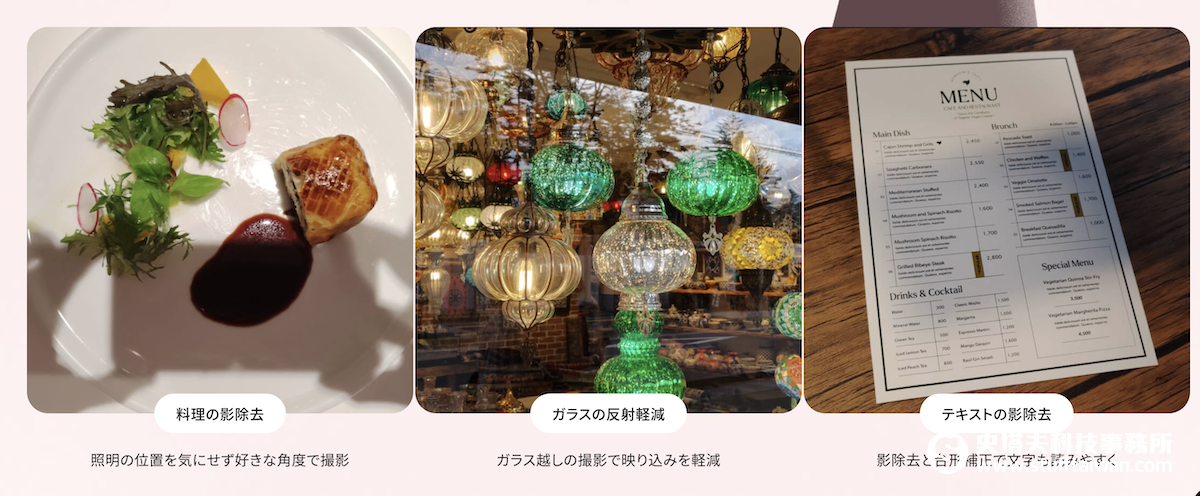 - AI自動除陰影: 延續「去除料理陰影」與「去除文件陰影」功能,讓畫面更純淨自然,文件掃描更清晰端正。