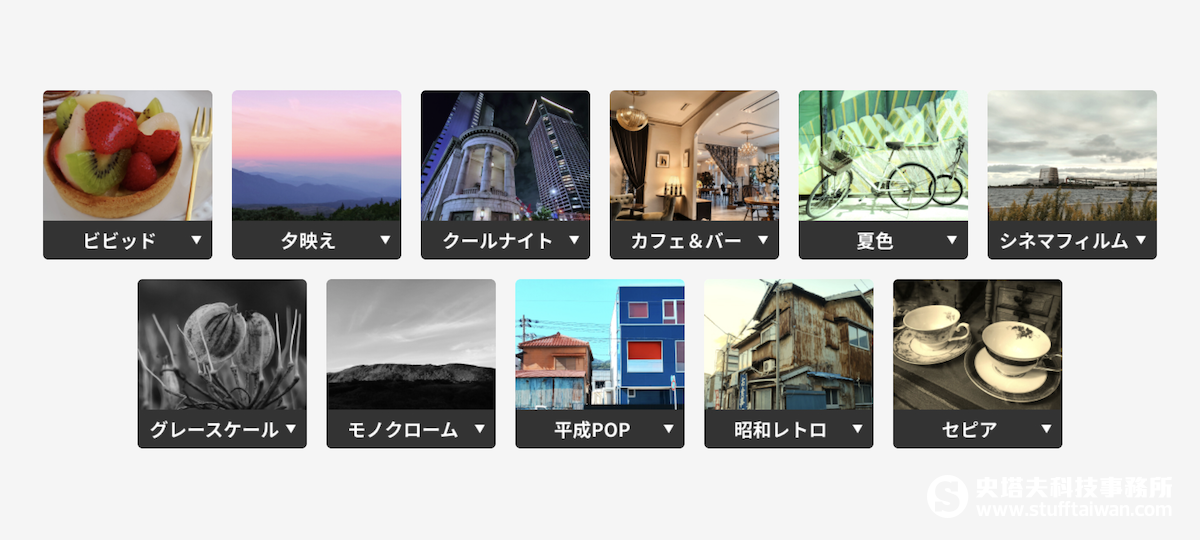 全新加入由專業攝影師監修的8種風格濾鏡,包含:「夕映(夕陽餘暉)」、「Cool Night(冷色夜景)」、「Café & Bar(咖啡吧風)」、「夏色(Summer Tone)」、「Cinema Film(電影膠卷)」、「Monochrome(黑白風)」、「Heisei Pop(平成流行)」與「Showa Retro(昭和懷舊)」。使用者可依個人喜好輕鬆套用,在不同情境下創造獨特氛圍的影像風格,讓日常拍攝更具樂趣與創意。