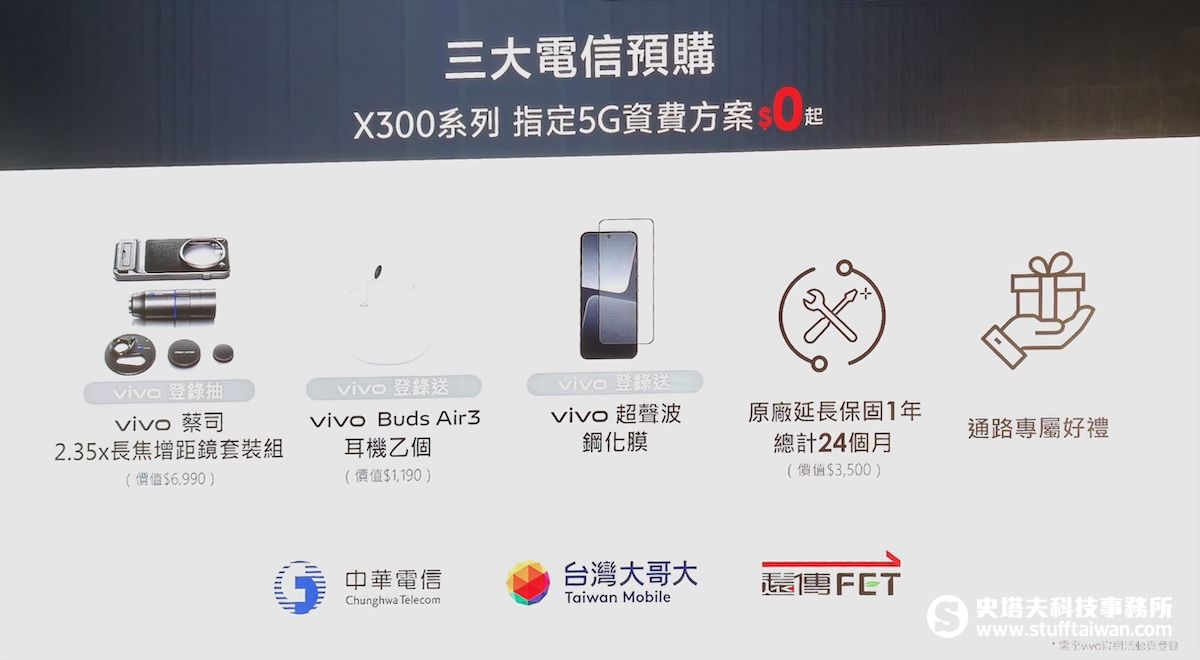 搭配中華電信、台灣大哥大與遠傳電信指定資費方案,X300系列最低可0元起輕鬆入手。凡完成vivo官網登錄,即可「抽」vivo蔡司2.35x長焦增距鏡套裝,並加碼贈送vivo Buds Air3耳機等好禮。