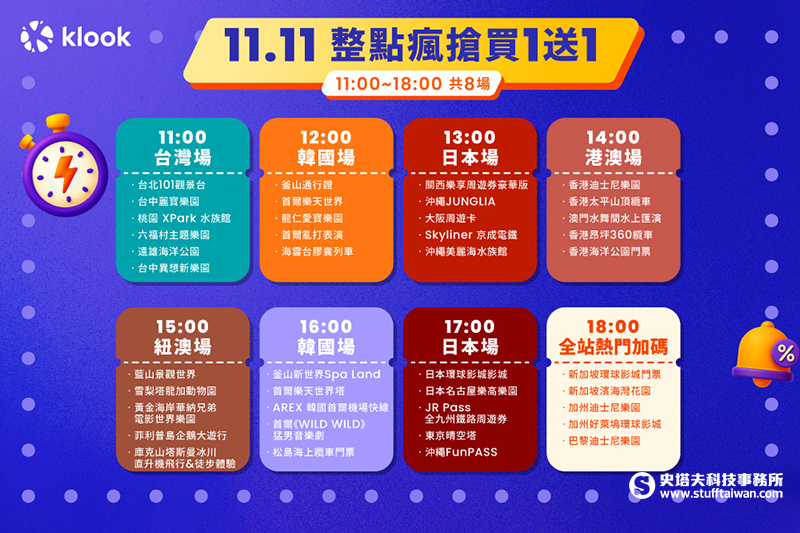 Klook將於11月11日當日,11點至18點推出整點瘋搶「買1送1」活動,輸入指定優惠碼即可享受超值優惠。