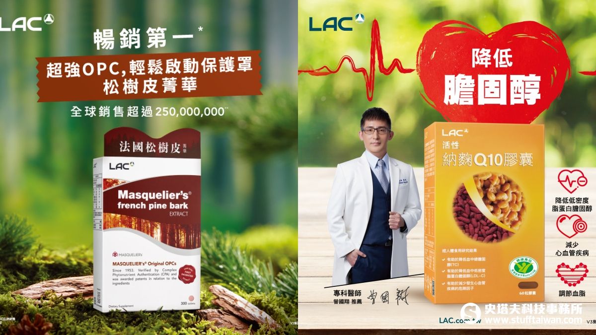- LAC 活性納麴 Q10 膠囊: 結合納豆、紅麴兩大核心成分,再加入輔酵素 Q10 及大豆抽取物,經衛福部健康食品認證,證實有助於降低血中總膽固醇,減少心血管疾病危險因子。