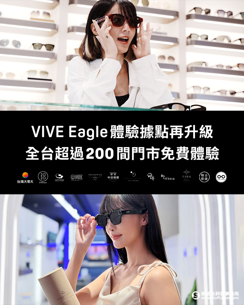 HTC 宣布 VIVE Eagle AI 智慧眼鏡自上市以來反應熱烈、體驗需求持續攀升,HTC 與台灣大哥大擴大合作,將自 11 月 5 日起於全台新增 104 家 myfone 直營門市展示 VIVE Eagle,服務範圍將涵蓋主要都會區、重點城市商圈及鄉鎮區域,讓消費者能就近前往門市體驗及選購,親身感受 AI 穿戴科技的便利與魅力。