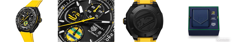 腕錶搭配亮眼的黃色橡膠錶帶,並以飾有三色條紋的深藍色專屬錶盒包裝,內附旅行收納包,色彩設計皆呼應洗拿頭盔配色,延續其賽道精神於腕間。