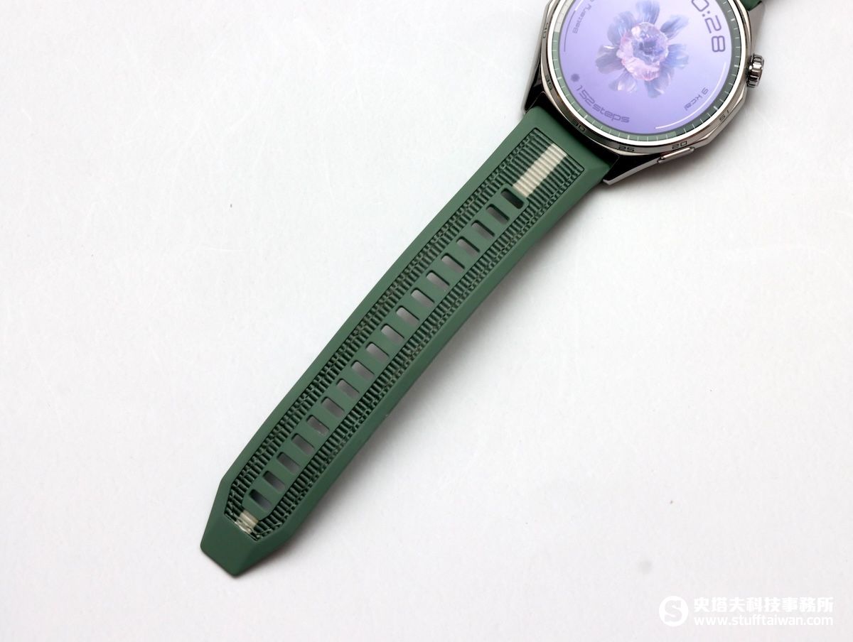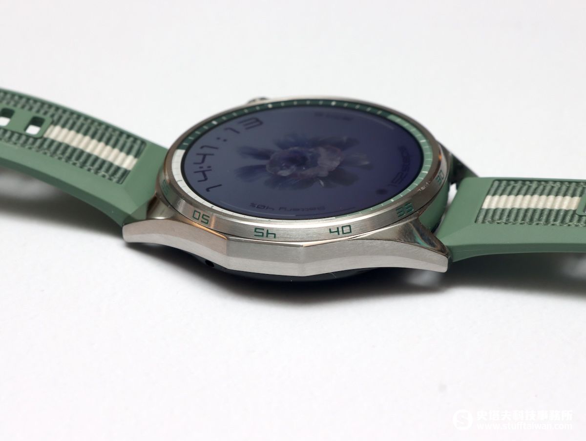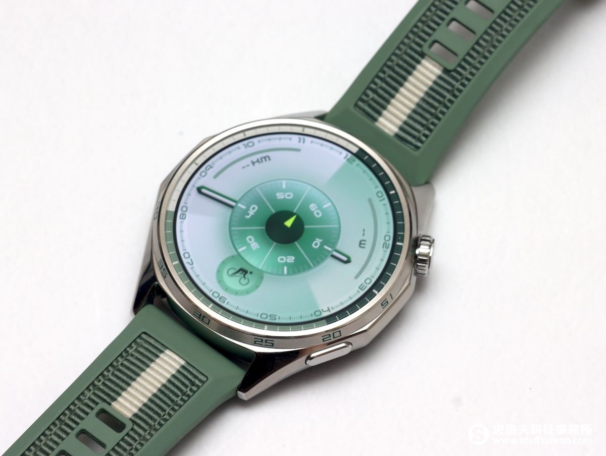 本次開箱「原野綠」的WATCH GT 6,採用46mm的大錶徑設計,錶殼線條俐落,搭配立體刻度的計時錶圈,展現出旗艦手錶應有的力量感。最具巧思的部分,莫過於錶圈上那層次豐富的綠色漸變效果,彷彿將山野的幽深與清晨的露水凝結在方寸之間,從淺綠到深綠的平滑過渡,極富辨識度,讓手錶在視覺上遠離傳統運動手錶的單調。