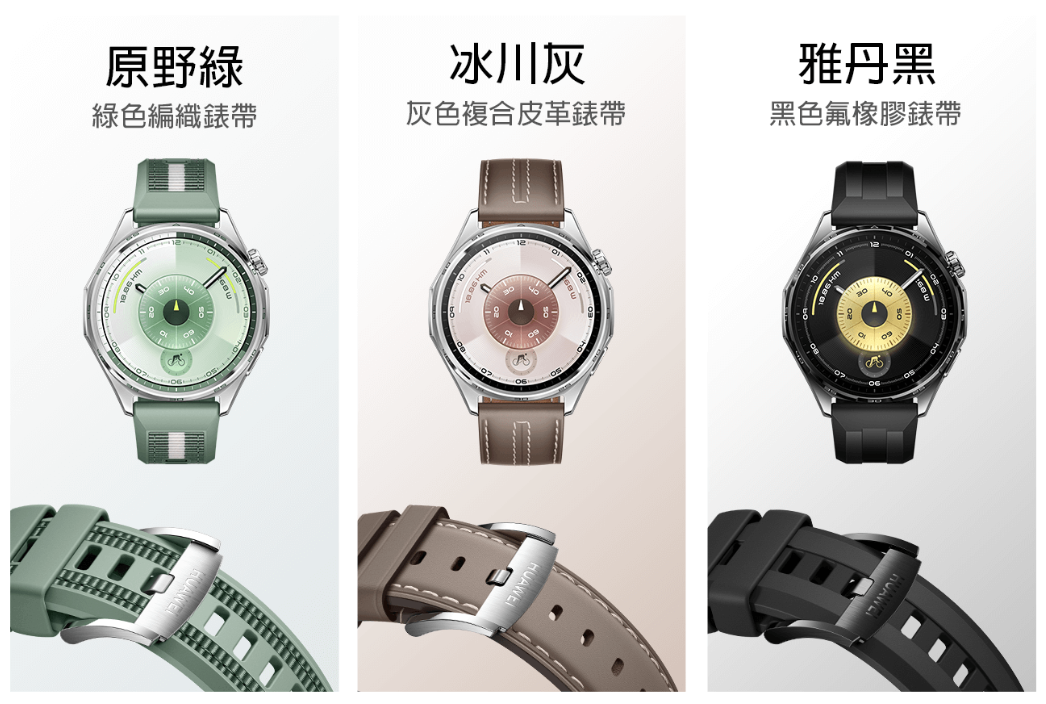 HUAWEI WATCH GT 6系列共有41mm與46mm兩種尺寸,46mm有以下三款:「原野綠」編織錶帶、「雅丹黑」氟橡膠錶帶、「冰川灰」複合皮革錶帶;41mm有以下四款:流光紫「氟橡膠錶帶」、浮光白「複合皮革錶帶」、金色「米蘭尼斯錶帶」、馬鞍棕「棕色真皮錶帶」,建議售價都是9,990元。