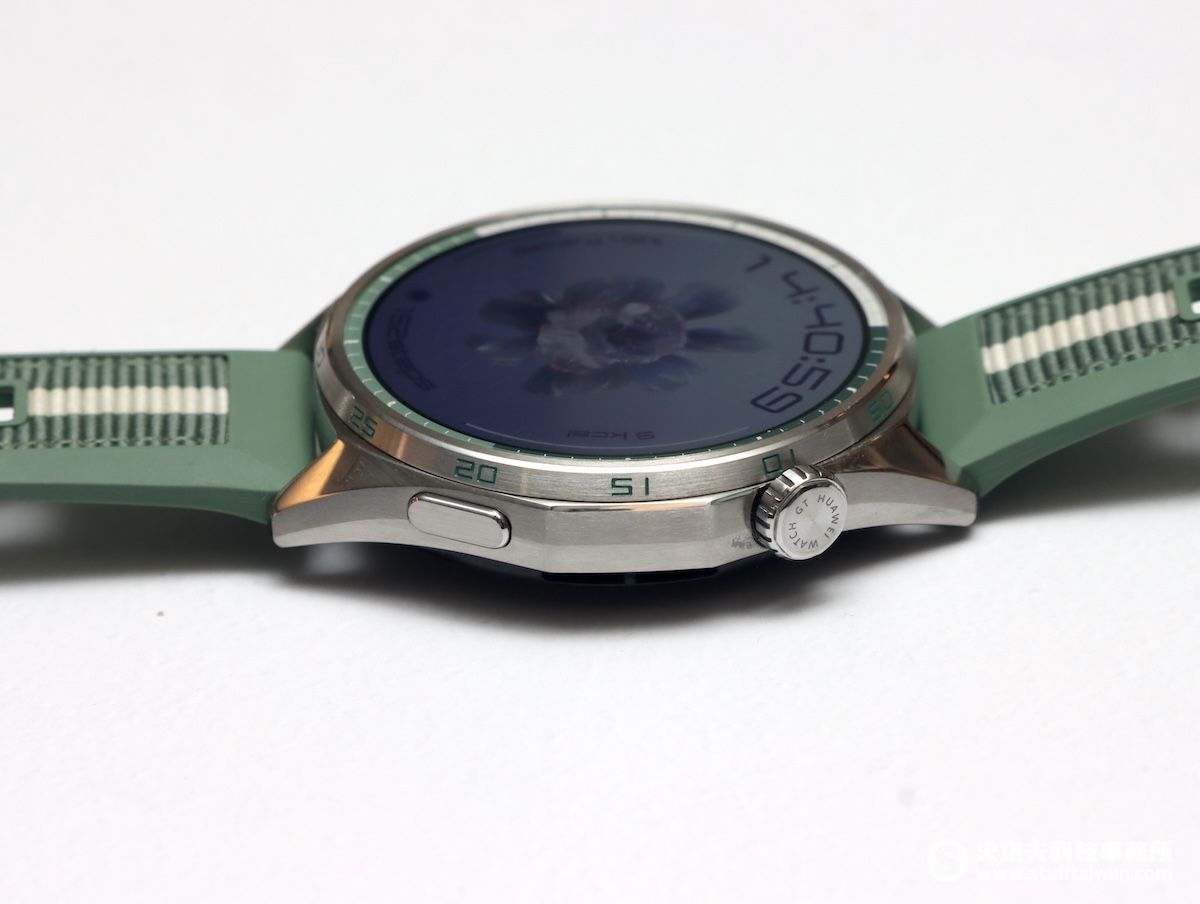 本次開箱「原野綠」的WATCH GT 6,採用46mm的大錶徑設計,錶殼線條俐落,搭配立體刻度的計時錶圈,展現出旗艦手錶應有的力量感。最具巧思的部分,莫過於錶圈上那層次豐富的綠色漸變效果,彷彿將山野的幽深與清晨的露水凝結在方寸之間,從淺綠到深綠的平滑過渡,極富辨識度,讓手錶在視覺上遠離傳統運動手錶的單調。