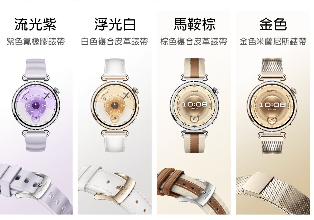 HUAWEI WATCH GT 6系列共有41mm與46mm兩種尺寸,46mm有以下三款:「原野綠」編織錶帶、「雅丹黑」氟橡膠錶帶、「冰川灰」複合皮革錶帶;41mm有以下四款:流光紫「氟橡膠錶帶」、浮光白「複合皮革錶帶」、金色「米蘭尼斯錶帶」、馬鞍棕「棕色真皮錶帶」,建議售價都是9,990元。