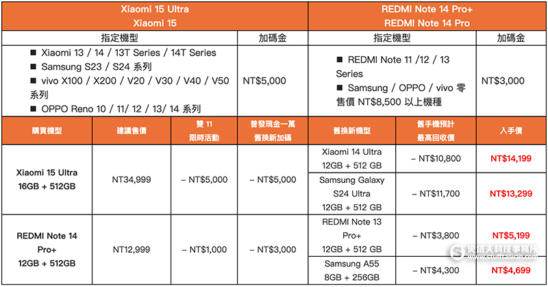 - 第一重 換新禮:小米之家以舊換新最高加碼 NT$5,000 持指定舊手機購買 Xiaomi 15 Ultra 最高現折 NT$21,700