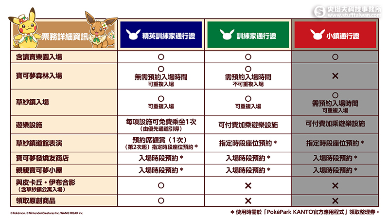 ・「寶可夢森林」為擁有階梯與陡峭坡道、自然生態豐富的森林區域。為維護訓練家安全,設有入場限制。未滿5歲幼童與其同行者、無法攀爬110階階梯者等,凡符合官方網站「票務資訊」所列入場限制條件者,即使有陪同協助者亦無法入場。