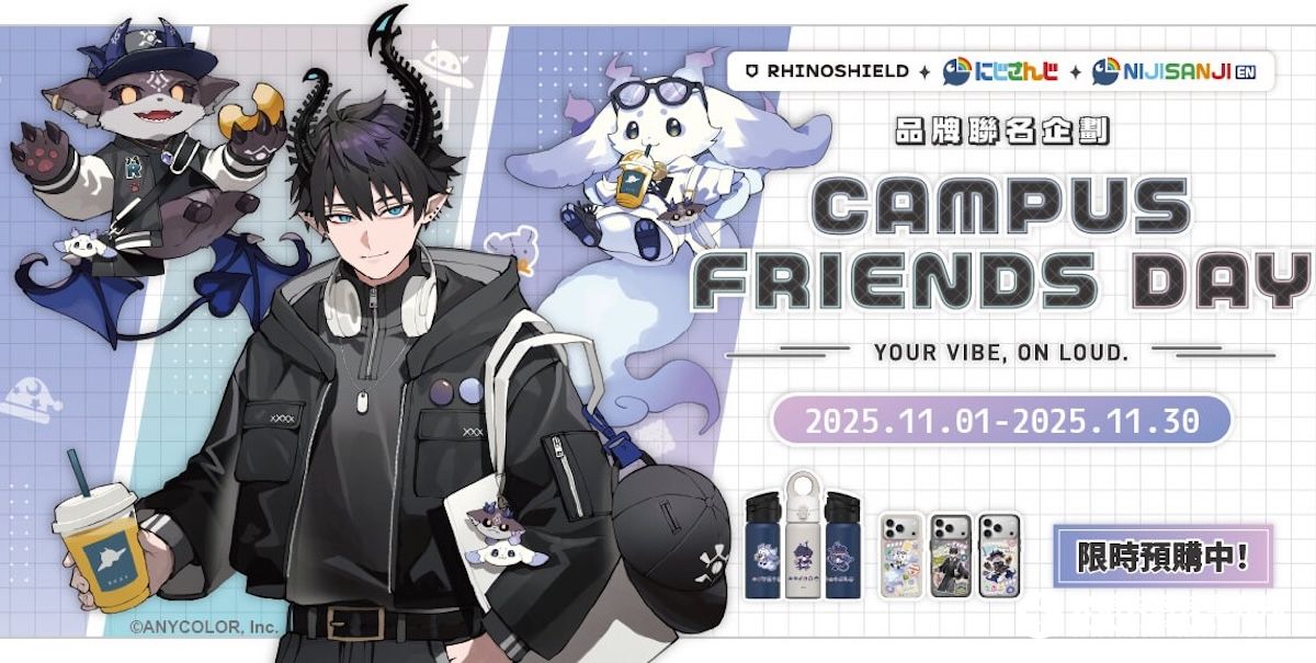 本次合作集結三位人氣 VTuber——「Lunlun」、「Debidebi Debiru」以及「Ren Zotto」——以校園主題推出限定設計系列商品,包含犀牛盾知名的防摔手機殼與 AquaStand 磁吸水壺。