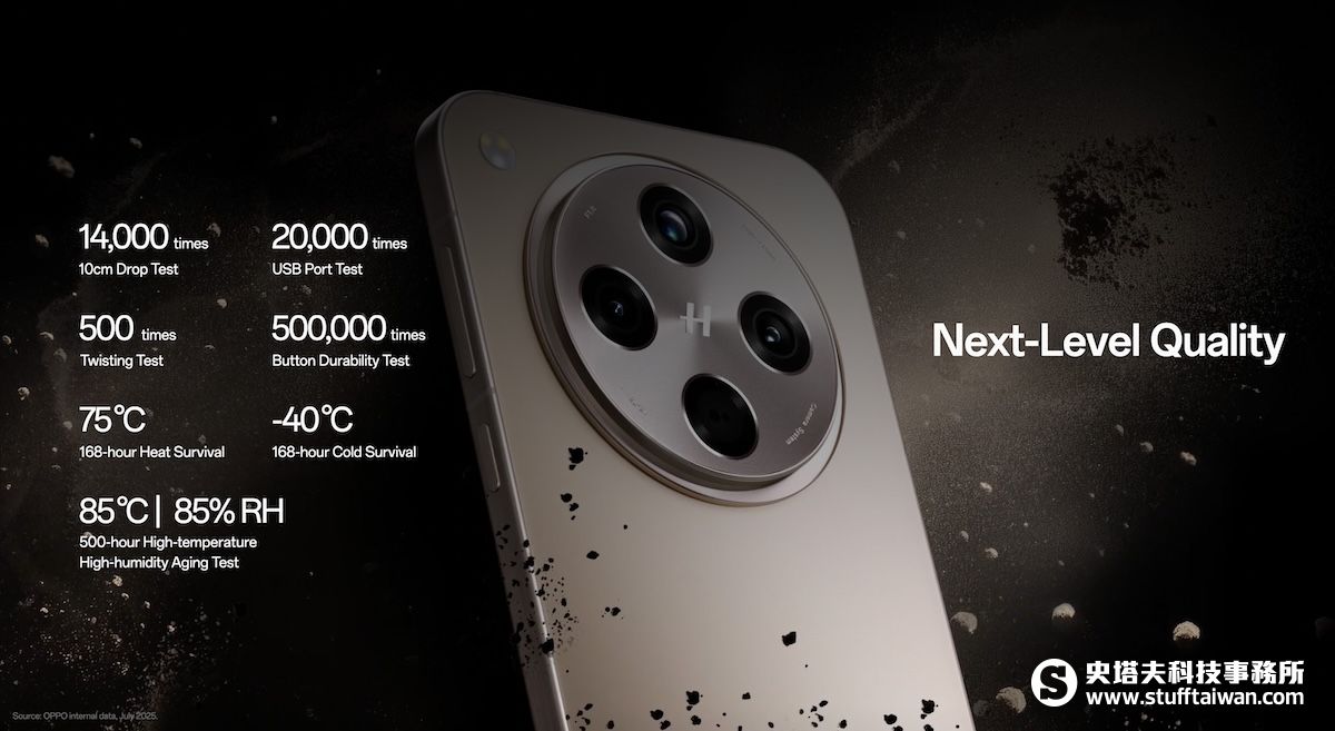 延續 OPPO 以科技創新回應用戶需求的初心,「Apex Guard 無懈品質」方案將從三大面向強化產品品質並落實於全產品線。首先是超越日常使用的流暢體驗,OPPO 在產品材料與設計上持續推動創新,採用超高強度鋼材與航太級鋁合金,並導入晶盾玻璃,不僅有效防護意外進水、摔落等突發狀況,更提供超越日常使用的可靠保護。