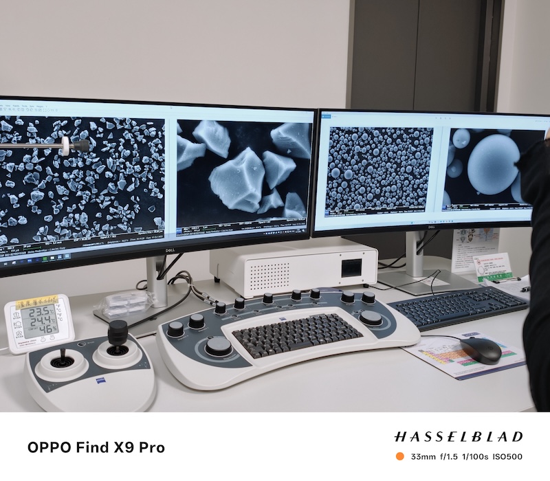 在掃描電鏡實驗室,利用解析力最高可達0.5奈米的電子顯微鏡,深入微觀世界,探究材料的秘密。例如,Find X9系列中使用的球形矽碳材料,就是在這個實驗室誕生。這種球形材料在擠壓時結構穩定性更好,能夠在長時間循環中維持完美結構。其顆粒尺寸約為7到8微米,比人類頭髮絲直徑小十分之一。此外,實驗室還有摩擦磨損測試、恆溫測試、彎折測試、材料老化測試等,以保證新材料的適用性和手機的良品率。在摩擦磨損實驗室,測試OPPO專用材料的耐磨性,要求經過100萬次磨損測試後仍能保持性能,遠超用戶的日常使用極限。