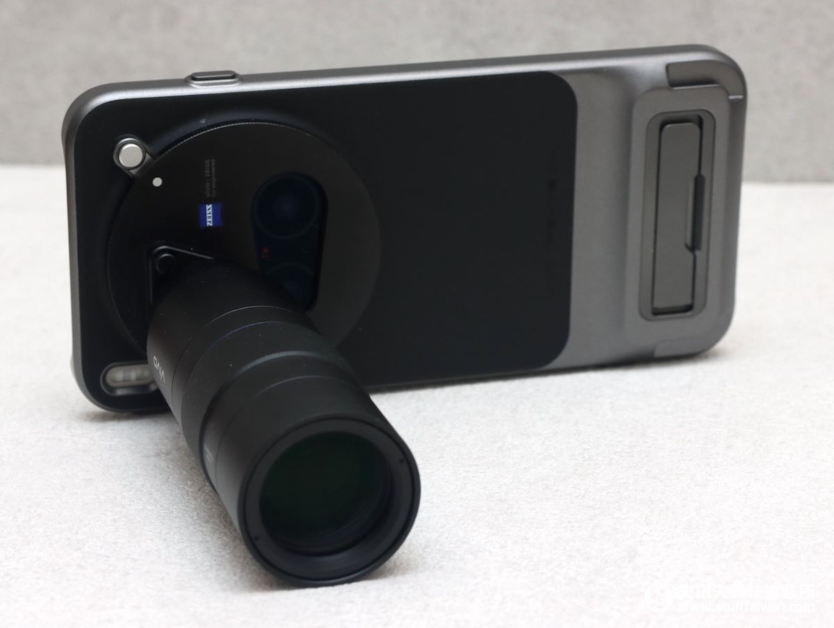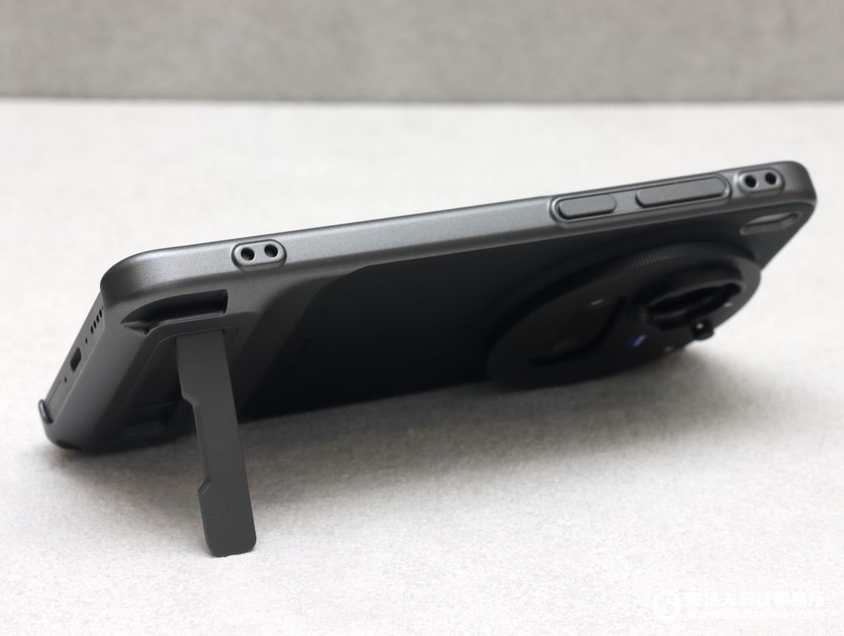 這款保護殼背面還有支架,可將手機放在桌面上觀賞影片,保護殼就算不搭配蔡司2.35x增距鏡,也能單獨使用。