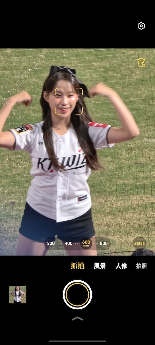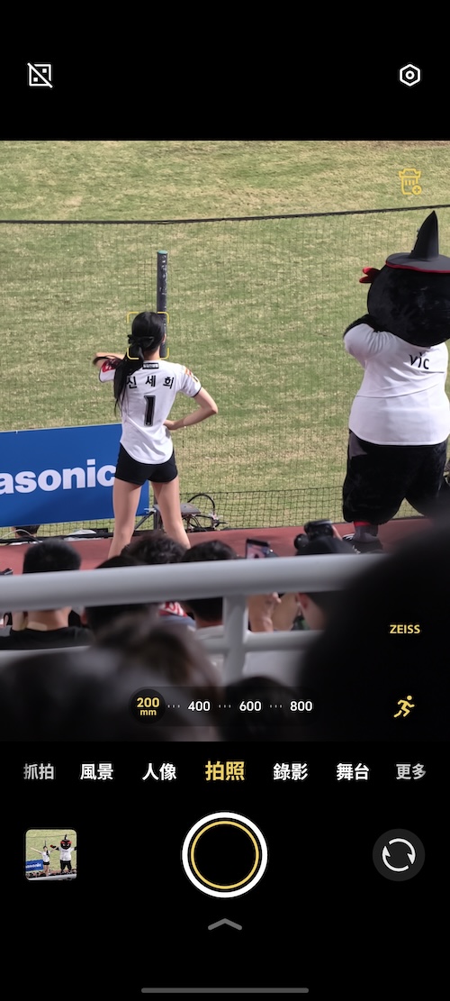 在不久前,11/7與11/9的亞洲職棒交流賽中,我都使用X300 Pro進行實測,其中11/7的座位在西下區倒數3排,可搭配增距鏡使用;而11/9的座位在東下前兩排,則單獨使用X300系列的人像模式。在桃園棒球場實拍KT Wiz啦啦隊Lady Wiz時,X300 Pro長焦能力展現出驚人的實用性,20倍超遠距運動抓拍結合了最新的AIGC大模型演算法,搭配增距鏡更是無往不利。