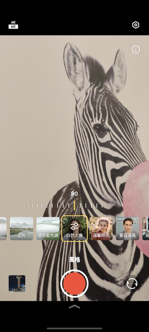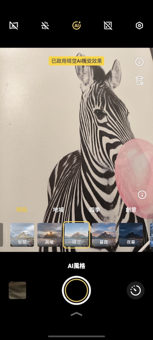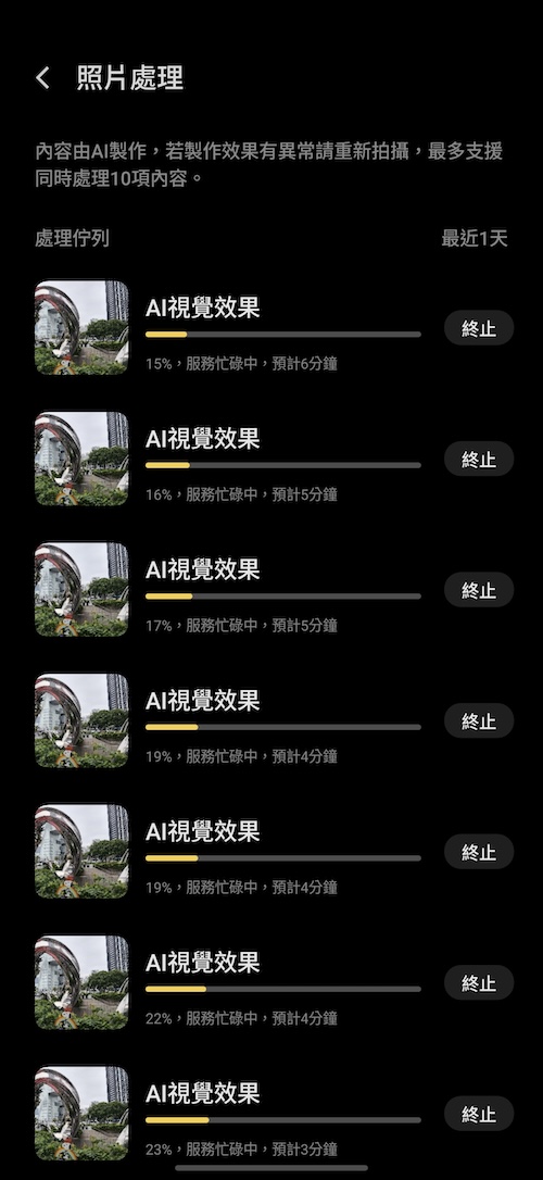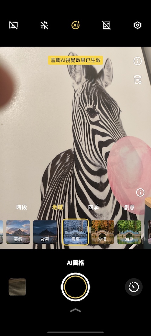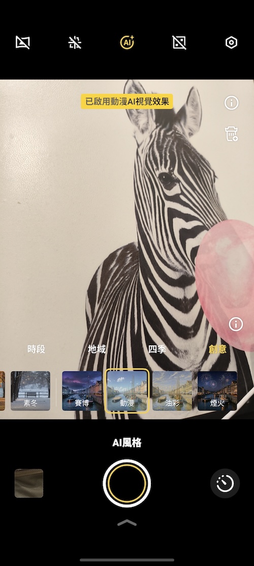 AI視覺效果不只是濾鏡,而是同步結合實景融入AI生成功能,一次最多可拍攝10張AI視覺效果,需要花一點時間來生成。