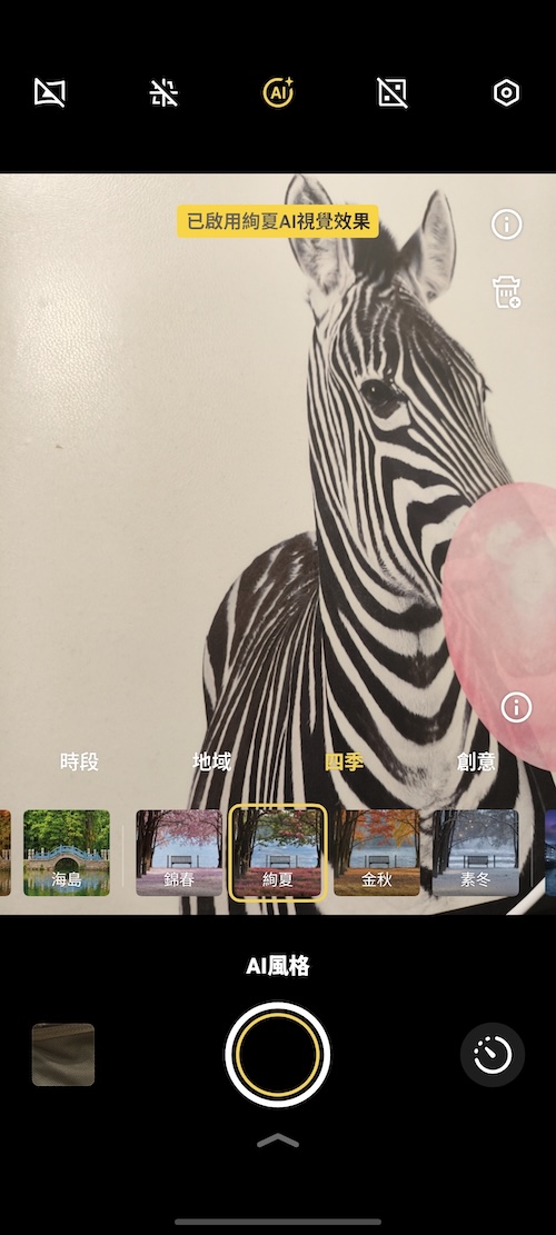 AI視覺效果包括:時段、地域、四季、創意四大類,使用此功能時必須連上網路,Wi-Fi或是行動網路皆可。