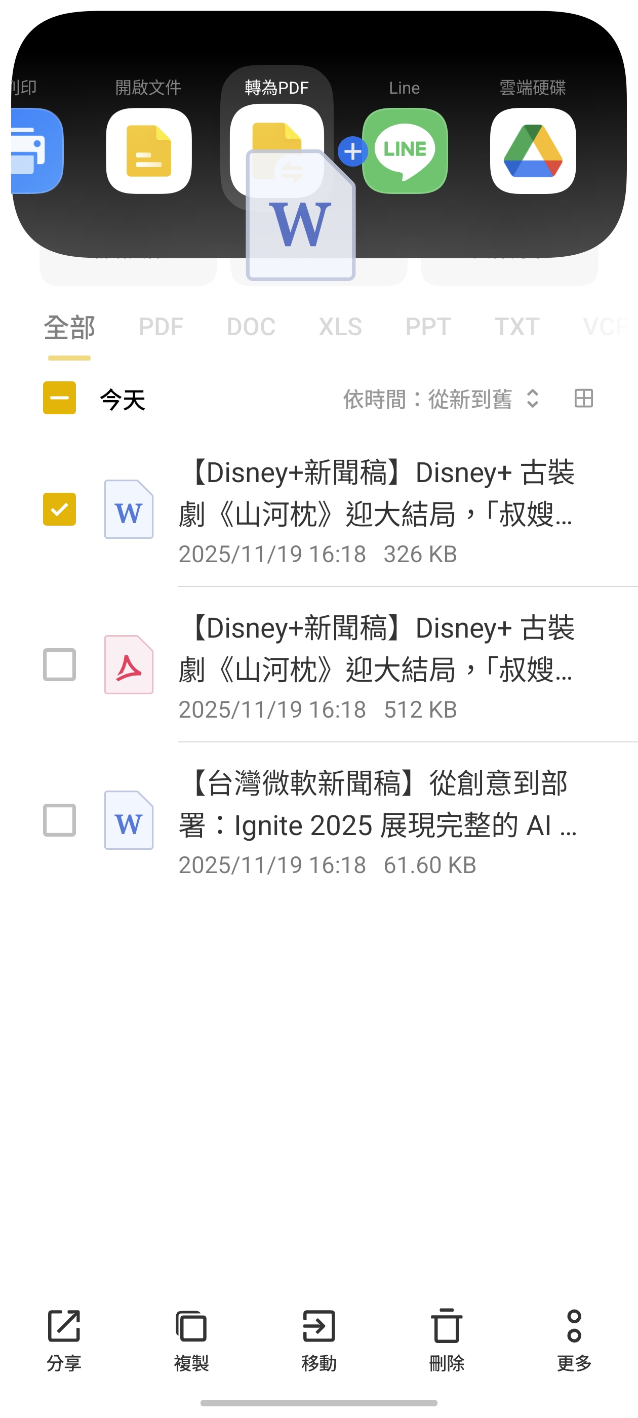 如果將文件傳送到上方的原子島時,甚至可以快速將文件轉為PDF檔。