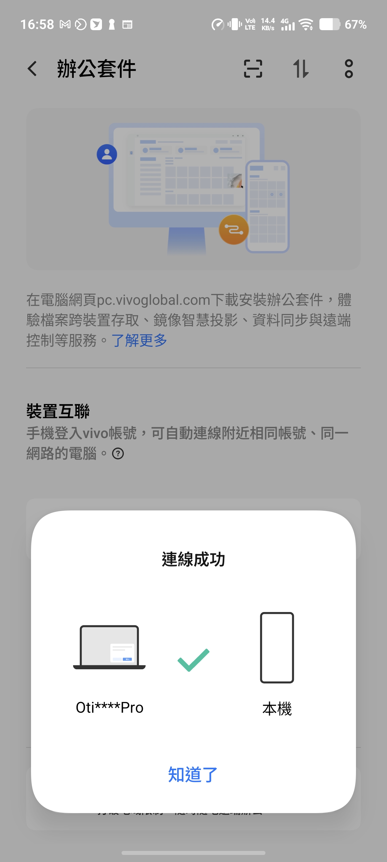 以MacBook版的vivo辦公套件為例,都登入相同的帳號,並連線同一個Wi-Fi網路後,可自動裝置互聯。