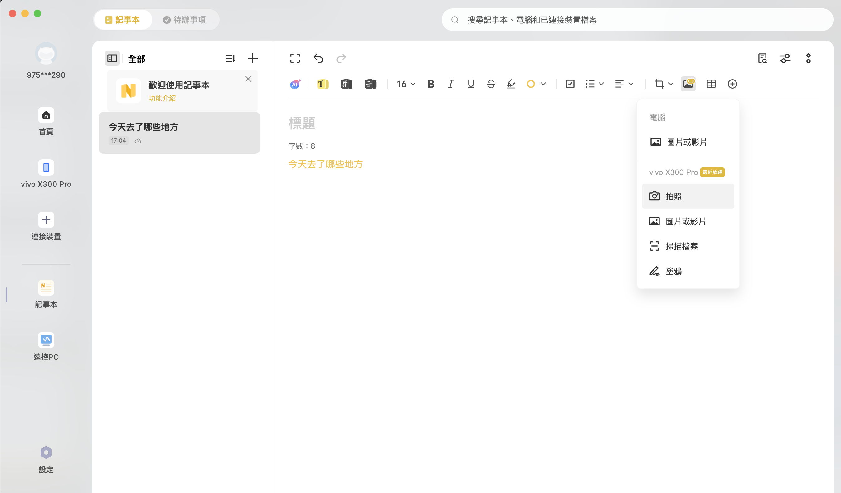 記事本同步支援手機與電腦間的跨裝置同步,使用者在電腦編輯筆記時,可連接手機,即時拍照、掃描文件、手寫塗鴉,或直接插入圖片與影片至筆記中。
