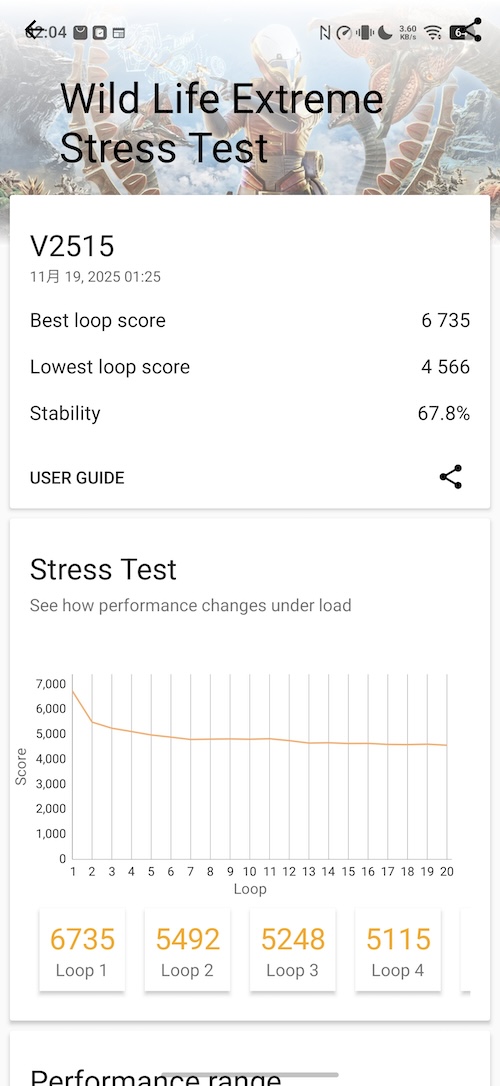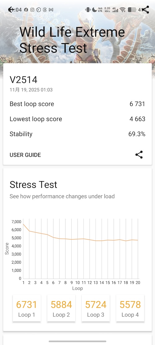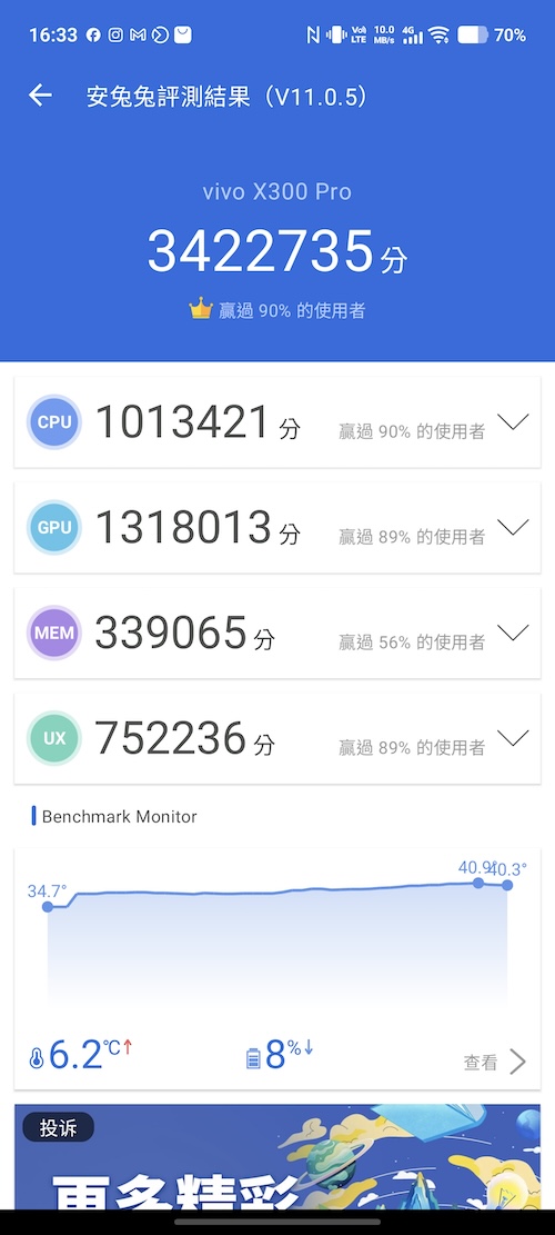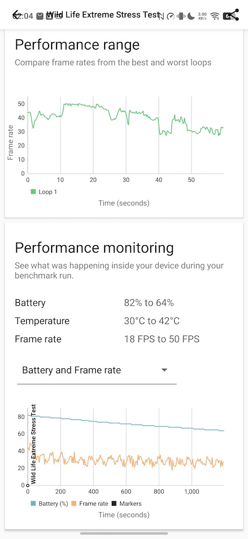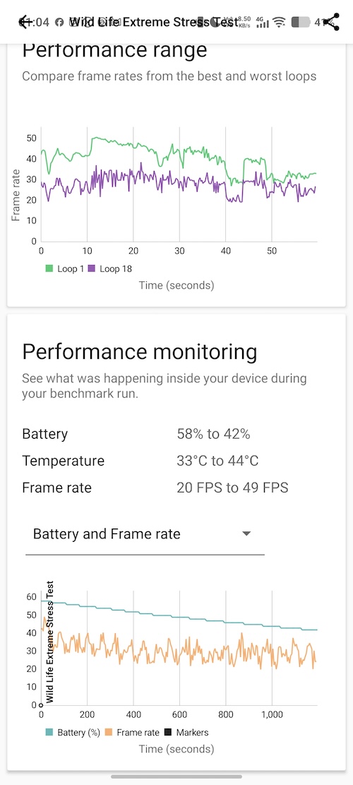 X300 Pro跑3Dmark-Wild Life Extreme壓力測試20分鐘,穩定度為69.3%,期間電量從58%降為42%、溫度從33度升上44度。