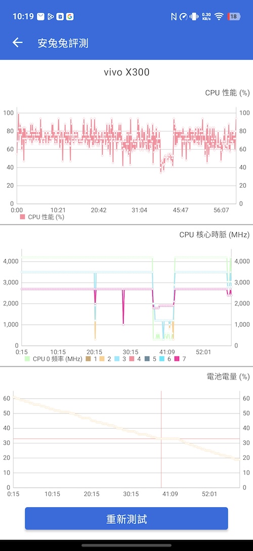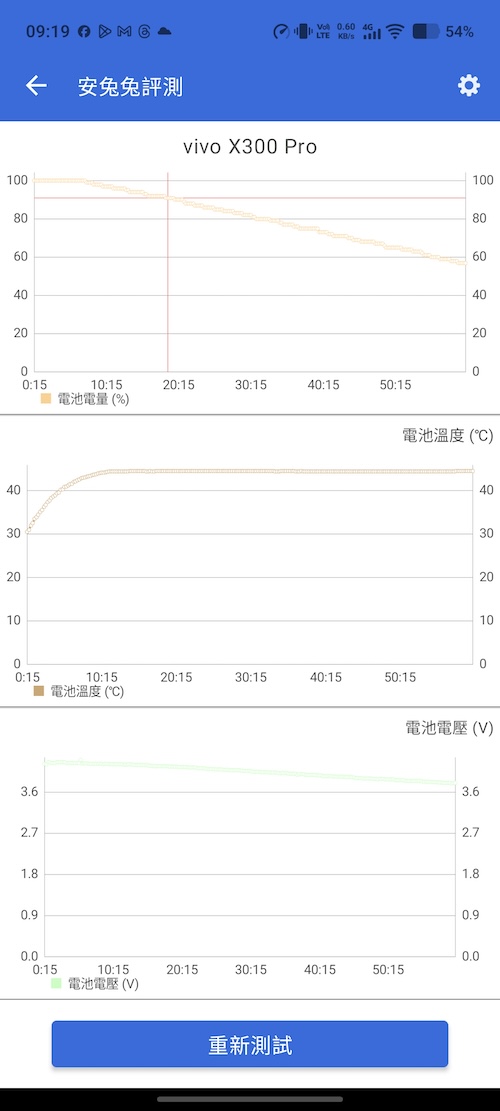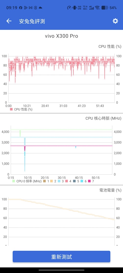 X300 Pro跑安兔兔壓力測試1小時,期間內整體時脈相當穩定,溫度從30度最高升上45度、電量從100%將為54%。