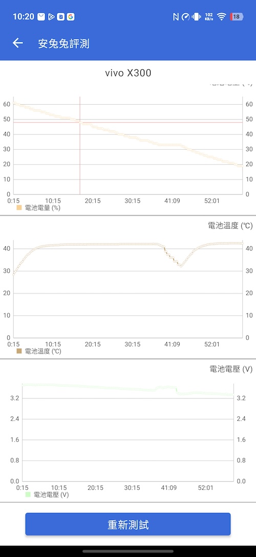 X300跑安兔兔壓力測試1小時,溫度從28度最高升上43度、電量從62%將為18%。