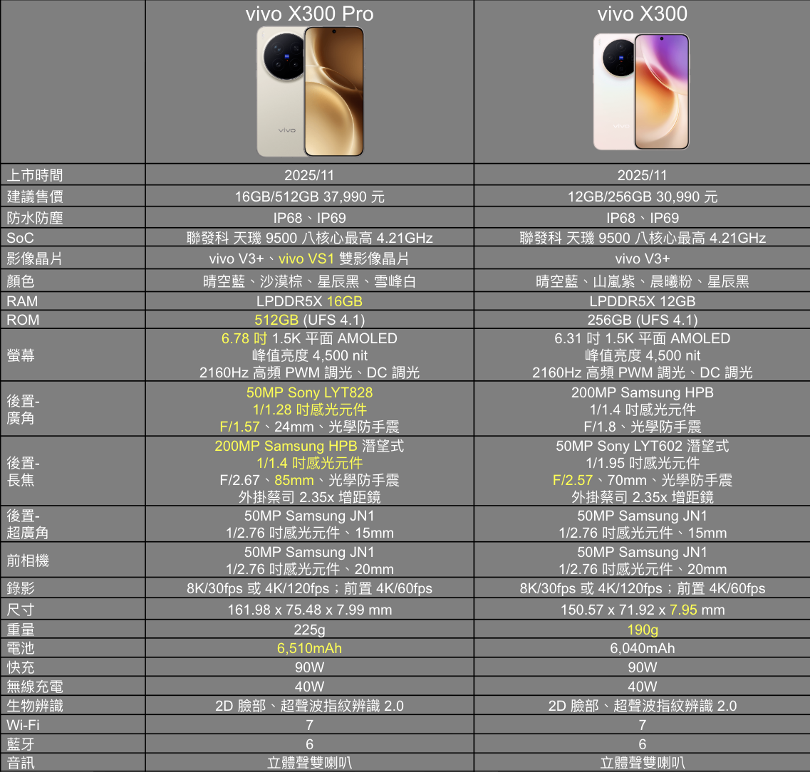 以下是vivo X300與X300 Pro的規格比較,X300 Pro無疑是市面上規格領先的影像旗艦,而X300在6.31吋小螢幕旗艦中稱霸。