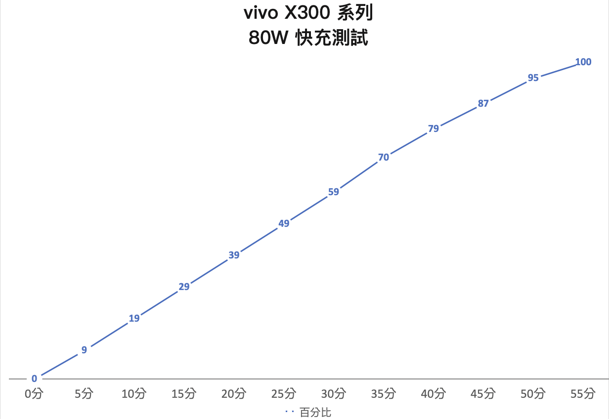 充電方面,X300系列皆支援90W有線充電與40W無線充電 ,並支援保護電池的旁路充電技術。雖然X300與X300 Pro兩款電量不同,但實際充電時間很接近,大約都是55分鐘充滿100%,25分鐘充約49%、40分鐘充約79%。
