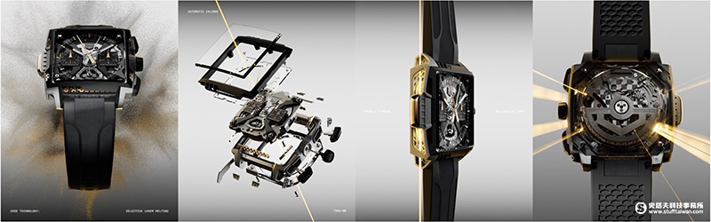 此全新腕錶的造型線條緊湊、如雕塑般精心雕琢、毫不妥協,象徵其突破性的技術革新。其超輕量的 5 級鈦金屬錶殼,是採用選擇性雷射熔融(Selective Laser Melting, SLM)先進製程所打造而成,這是一種應用於航太、醫療與汽車等領域、用以製作出複雜幾何形狀精密零件的增材製造技術。