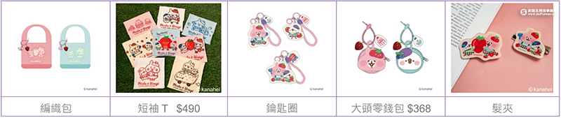 出門包包很重要,東西全都放進藍色或粉紅色的兩款P助與粉紅兔兔「編織包」中就對了!再把草莓龍摩托車、聖代大餐及天降莓果等共八款充滿小動物的超可愛「短袖T」穿上,萌萌氛圍拉滿。總是在找鑰匙的粉絲注意了,掛上拿著莓果的P助或粉紅兔兔等三款的「鑰匙圈」,讓你到家秒開門!