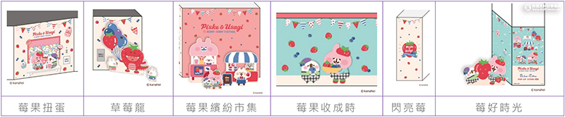 在快閃店遠方就看到一群超萌小動物們在歡樂慶祝著,原來是小動物們的莓果攤販及喵喵喵咪銷售員在邀請你一起加入「莓果繽紛市集」同樂啦!P助及粉紅兔兔一起舉著大草莓的「莓好時光」真是太萌了,快來跟他們拍照留念,繼續往內走馬上看到「莓果收成時」P助與粉紅兔兔化身小果農、手捧各種莓果的可愛模樣,讓人真想吃一口碗中的草莓唷!