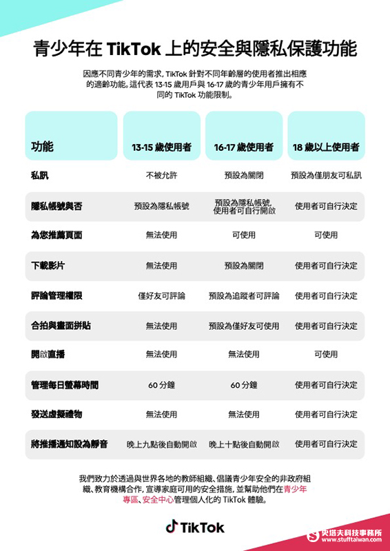 在適齡功能上,TikTok 上的青少年帳號預設內建超過 50 項安全保護措施,其中,所有 18 歲以下的使用者,帳號預設隱私帳號、無法使用直播內容、限制私訊功能使用,並預設螢幕使用時間限制為 60 分鐘,且在就寢時間後不會收到任何通知。平台同時也會過濾掉不適合青少年的內容,減少此年齡層的社群使用風險與過度使用。