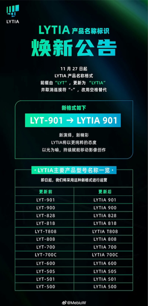 為進一步提升LYTIA的品牌認知度,Sony宣布將自「LYTIA 901」起,所有後續產品將統一採用「LYTIA(產品編號)」的命名規範。而自從11/27起,舊款的LYT系列也都通通更名為LYTIA,例如LYT900改為LYTIA 900、LYT 828改為LYTIA 828,以此類推。