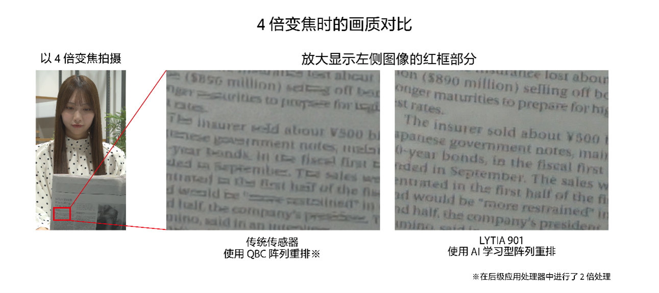 QQBC陣列恢復為常規像素排列的過程需要極高的運算性能。對此,Sony在LYTIA 901開發適配QQBC排列的AI學習型陣列重排技術,並將其處理電路整合於感測器內部,此舉引領了業界的新風向。AI學習型陣列重排可用於傳統方式難以再現的高頻成分訊號處理,在精細圖案、文字等微觀細節的表現上,呈現出更高的還原能力。同時,該技術的晶片內建整合還使高速處理成為可能,從而支援在4K解析度下、最高4倍變焦的規格下進行30fps的高畫質影片拍攝。