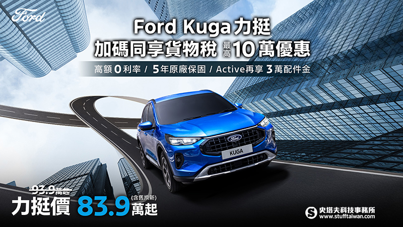 ※ 註二:The All-New Ford Kuga 1.5T享力挺價83.9萬起,係指The All-New Ford Kuga 1.5T Vignale建議售價93.9萬享5萬元力挺購車金,再扣除政府補助舊換新5萬元,詳細資訊請洽Ford經銷商。