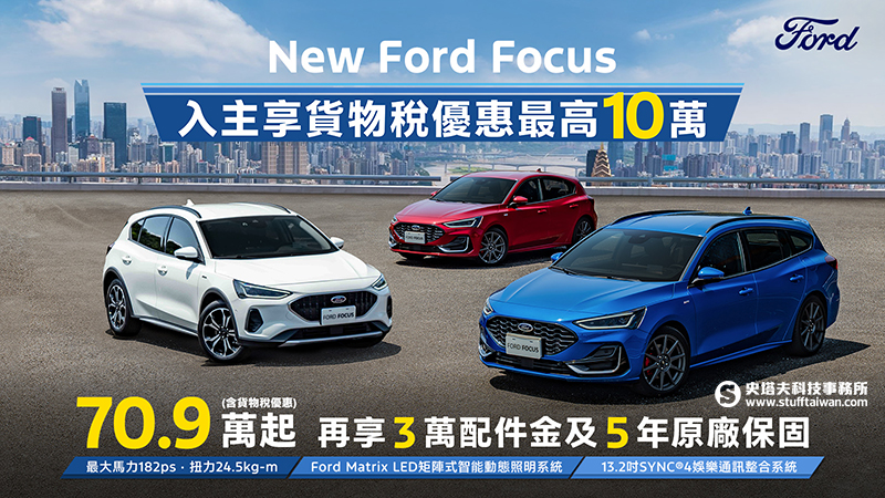New Ford Focus結合動感外型與德規品質,提供多種車型,從旅行車到跨界休旅一應俱全,入主享貨物稅優惠價70.9萬起,再享3萬元配件金及5年原廠保固;