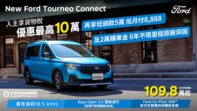 歐洲進口正七人座New Ford Tourneo Connect福特旅玩家,享貨物稅優惠價109.8萬起,再加碼享2萬元購車金、低頭款5萬、低月付8,888及6年不限里程原廠保固〔註四〕;