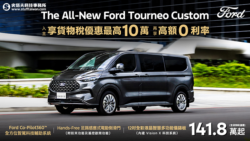歐洲首選國際商旅The All-New Ford Tourneo Custom福特旅行家,享貨物稅優惠價141.8萬元起,入主再享高額0利率。