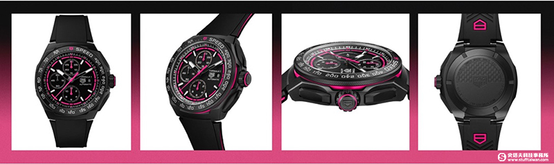 堅固的 44 毫米黑色 DLC 2 級鈦金屬錶殼,整體設計呈現了 F1 賽車的空氣力學線條與細節,黑色錶盤搭配鮮豔螢光粉色漆面刻度軌道,再以螢光粉色點綴計時指針、錶冠環與橡膠錶帶飾邊,將能量與律動感完美地融入腕間,展現賽車精神的無限張力。
