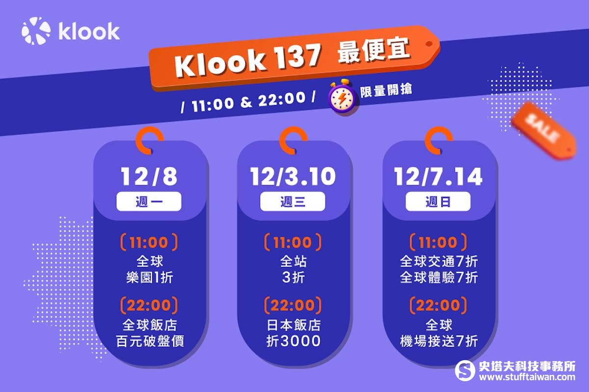 除了雙 12 期間的限時折扣,Klook 每週一、三、日的長期優惠也持續上線。每週一有日韓與全球指定樂園下殺 1 折、飯店「百元破盤價」;週三放送全站 3 折券;週日則有指定行程和交通商品 7 折禮遇。