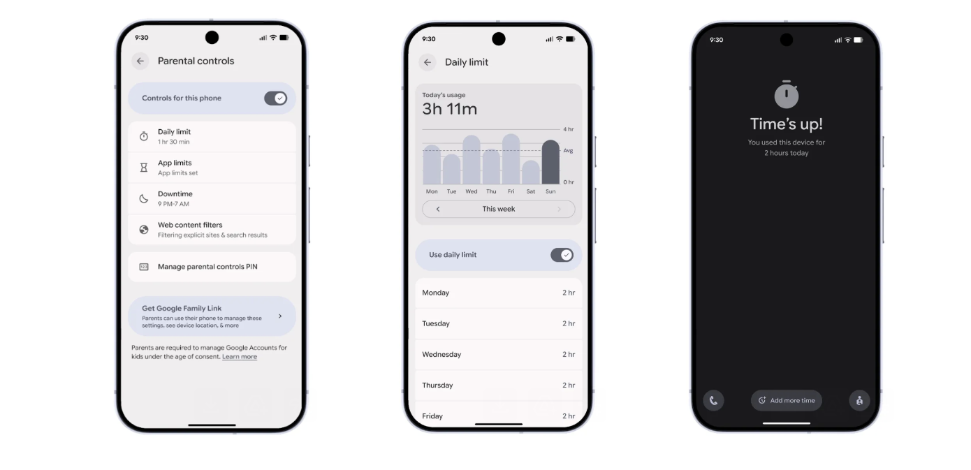 Android持續協助家長引導孩子與青少年建立健康的數位使用習慣。透過Android設定中的全新「家長安全監護」選項,家庭成員現在可以透過統一整合的入口,輕鬆使用內建的裝置管理功能與Google Family Link。