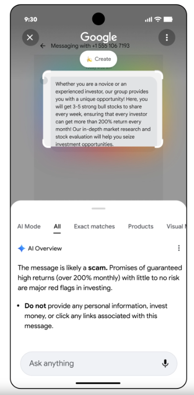透過 「畫圈搜尋」,使用者可以輕鬆搜尋螢幕上看到的任何內容,包括那些可疑的詐騙資訊。這項功能將結合來自網路的資訊與AI摘要(AI Overview),協助判斷內容是否可能涉及詐騙,並提供相關指引與建議步驟。使用者無需切換應用程式或中斷目前的瀏覽體驗,就能直接辨識潛在風險,有效提升數位安全。