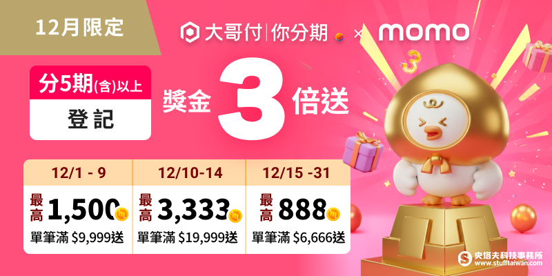 「大哥付你分期」於 momo 購物網推出「指定分期獎金 3 倍送」活動,自 12 月 1 日起三波段接力登場,用戶單筆結帳達指定金額並完成登記,即可獲得 mo 幣回饋。首波自 12 月 1 日至 12 月 9 日期間,單筆消費滿 9,999 元且選擇分 5 期(含)以上,登記成功即送 1,500 元 mo 幣回饋;