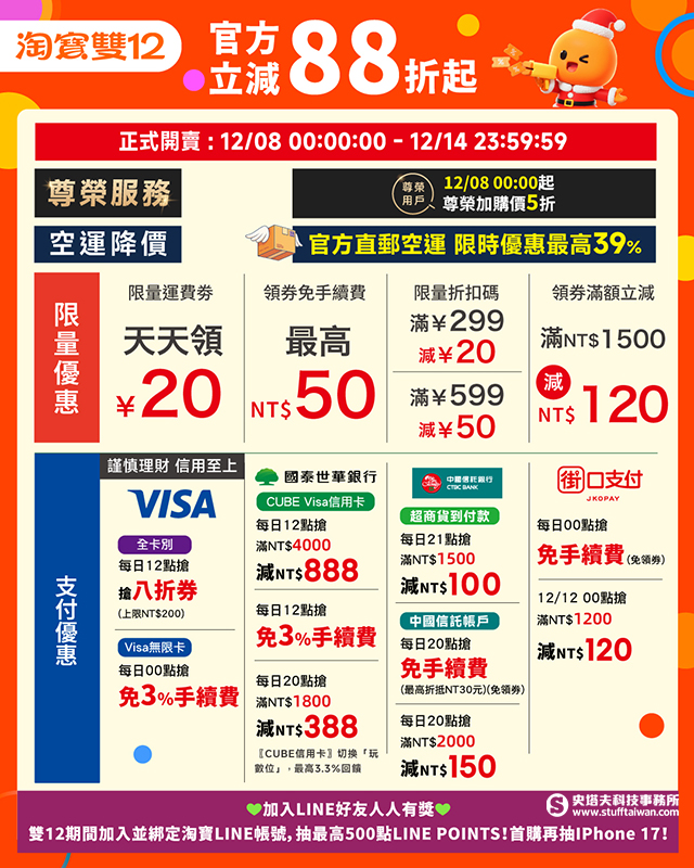 淘寶雙12優惠全攻略!官方88折起 + 77折券疊加,信用卡與電子支付回饋折上加折