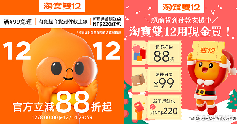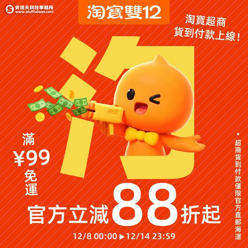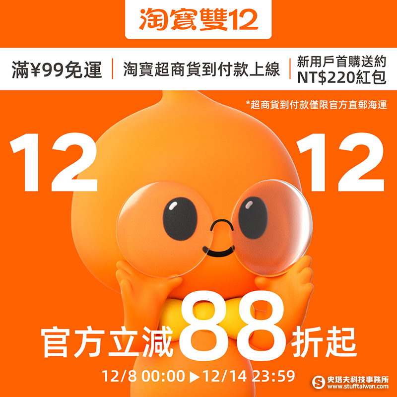 年終購物最後衝刺!「淘寶雙12」即將登場,搭上全民普發1萬元,淘寶再放大折扣!12月8日00:00起一路到12月14日23:59,全站商品推出官方 88 折起優惠,每日除可領取77折折扣券外,還能疊加其他優惠券,同步享有多家信用卡與電子支付回饋。