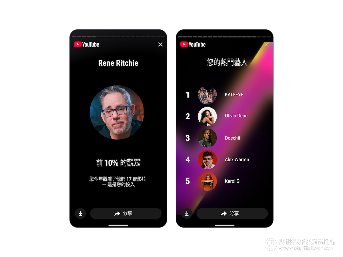 今年推出的「YouTube Recap」功能,化身為專屬的時光機,協助使用者整理出今年最常觀看的頻道、最感興趣的主題等多達 12 種不同的內容,甚至可以根據觀看紀錄分析「專屬觀看性格」,將年度回顧打造成更趣味、更容易分享給親朋好友的體驗。使用者只需在手機上打開 YouTube 應用程式並點選「個人中心」,或是在電腦上瀏覽 youtube.com/recap,即可開啟年度回顧故事。
