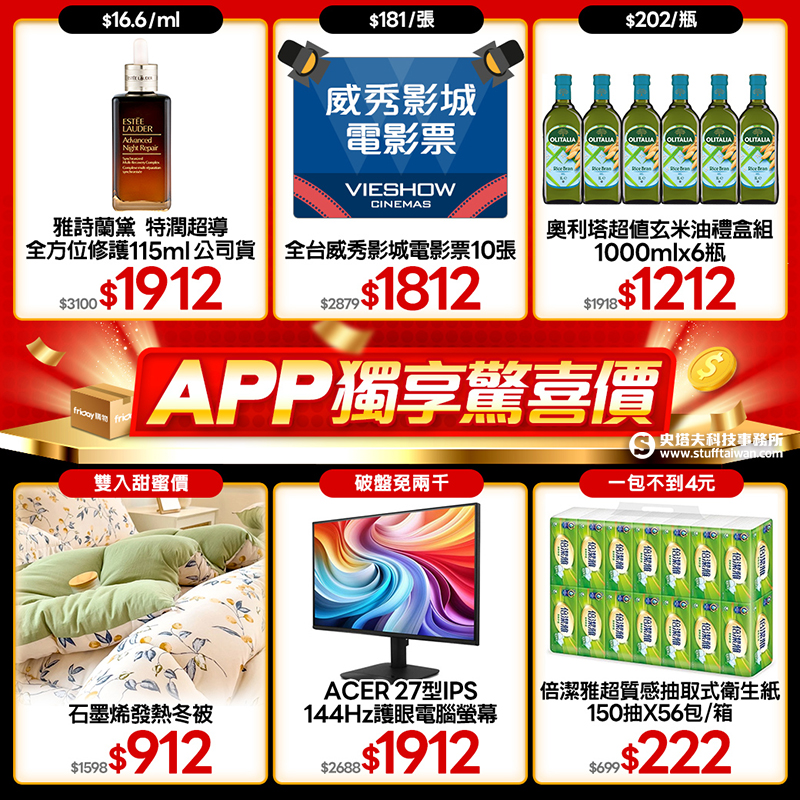 另外,現到friDay購物入手指定暖冬商品滿1,212元,就現折122元,還有領券現折1,212元、下殺至1,212元強檔組合商品等超強好康,年終購物狂歡再升級。