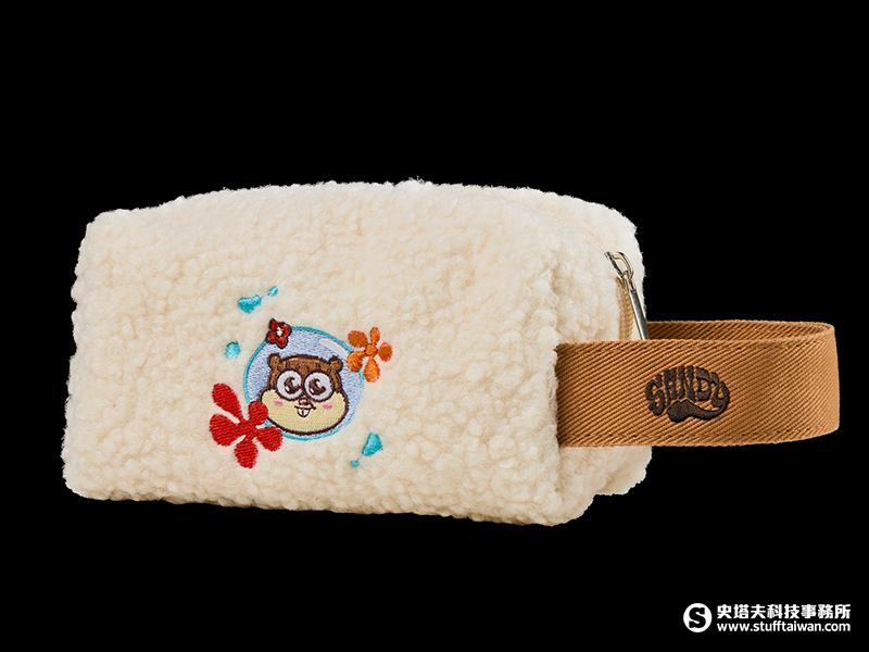 如果是愛美一族,就必須請出比奇堡最開朗又美麗的科學家珊迪!「羊羔絨化妝包」採用輕柔蓬鬆的羊羔絨材質,小巧容量適中,還有貼心手提設計。最吸引人的是包身上配有活潑可愛的Q版珊迪刺繡,收納或是化妝時都能被好好療癒,保持一整天的好心情。