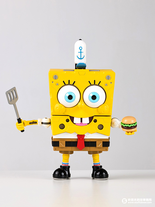 最讓人眼睛為之一亮的是「合金機甲海綿寶寶」,完美還原海綿寶寶造型以高質感的合金打造外殼,配合各種細節滿分的可動關節,以及可替換的表情、手部零件,即可穿戴的蟹堡王員工帽、鍋鏟及美味蟹堡,連可愛的大眼睛都能七百二十度自由轉動,栩栩如生,彷彿海綿寶寶就在眼前!