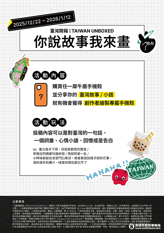 - 購買任一犀牛盾手機殼,並分享你的臺灣故事/小語,就有機會獲得創作者繪製專屬手機殼!